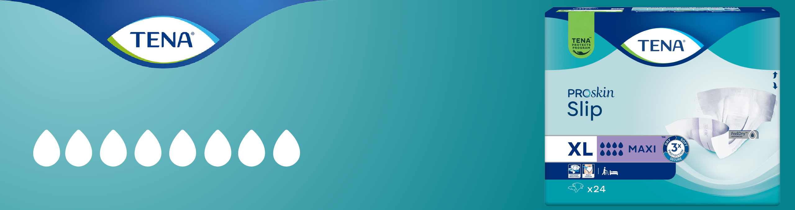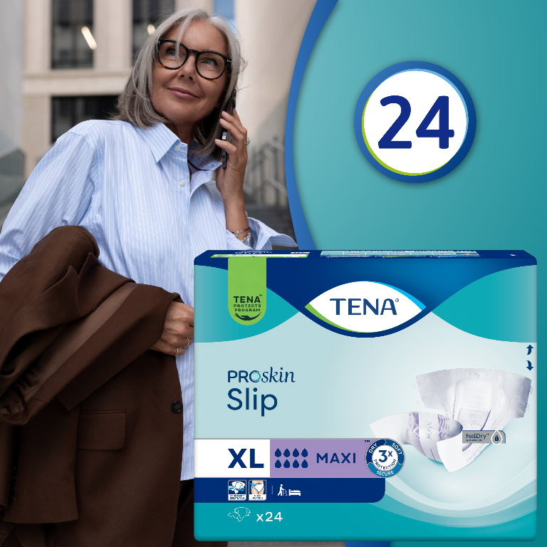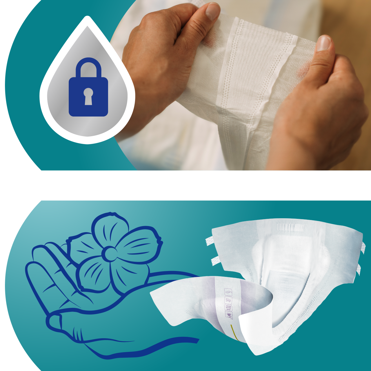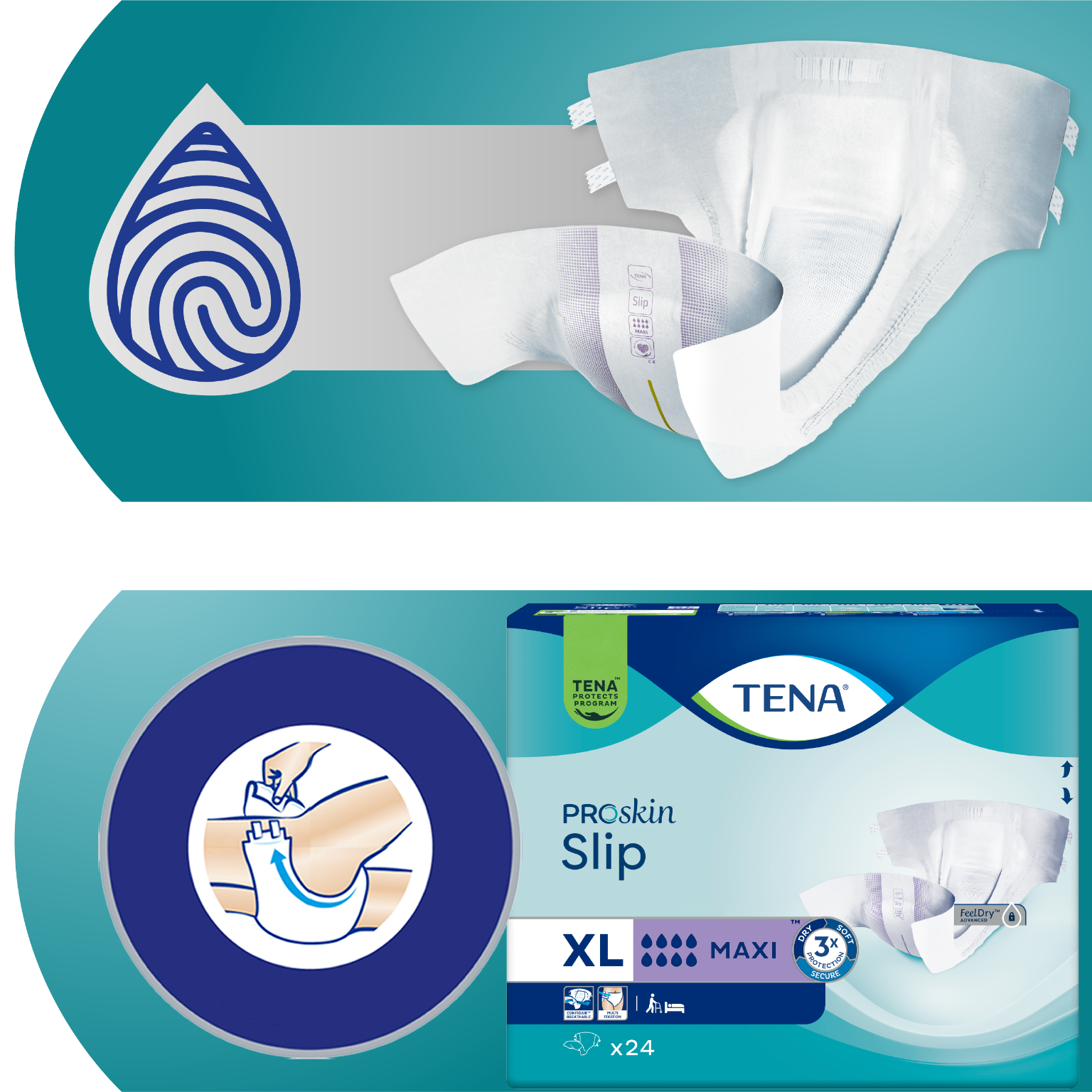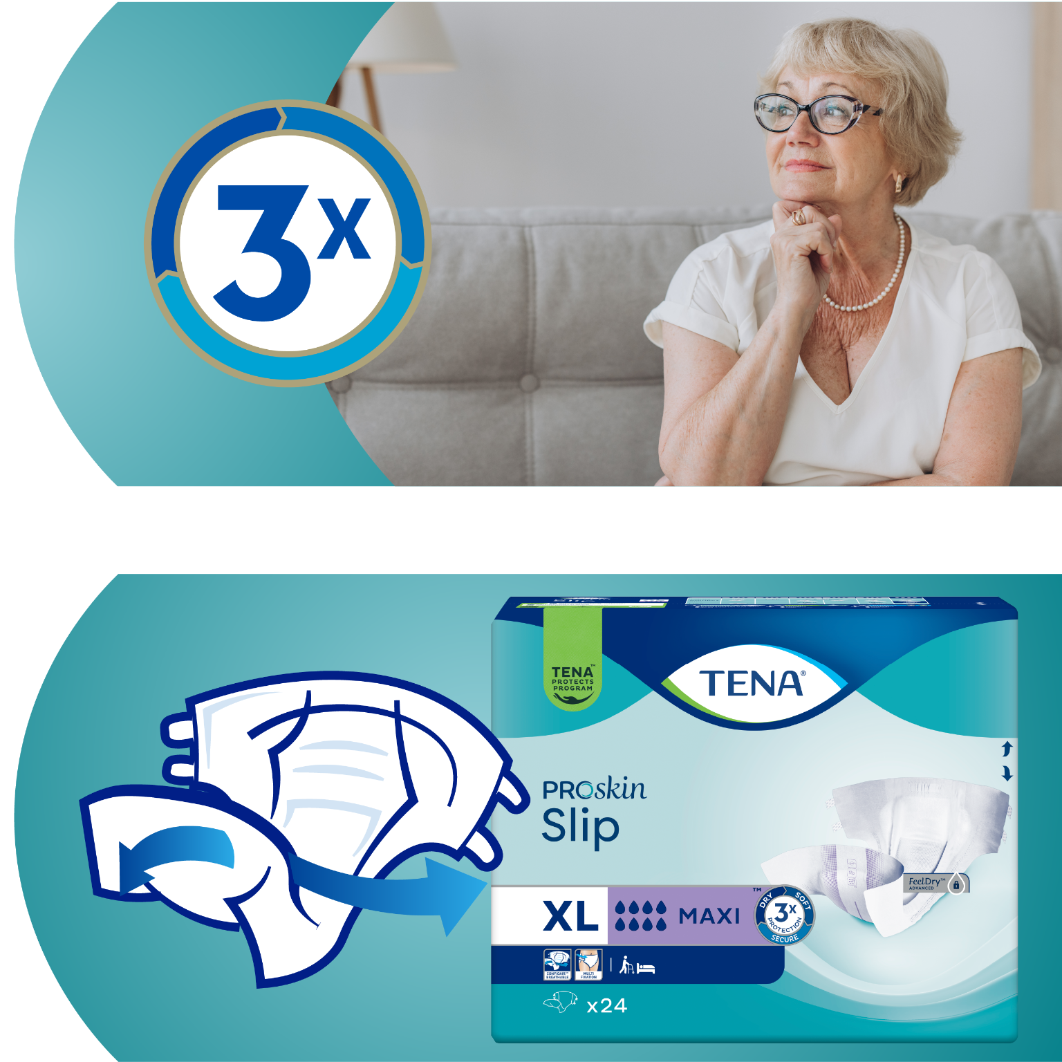Pieluchomajtki TENA Slip ProSkin Maxi zapewniają ochronę przed (1) przeciekaniem, (2) wilgocią i (2) nieprzyjemnym zapachem.