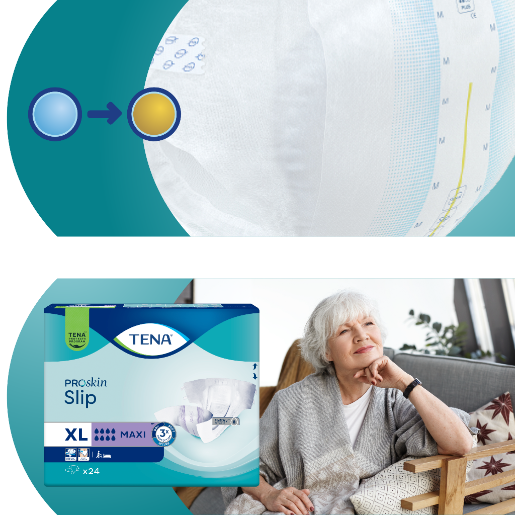 Na zewnątrz TENA Slip ProSkin Maxi znajduje się wskaźnik wilgoci, który zmienia kolor z żółtego na niebieski, kiedy produkt wymaga zmiany.
