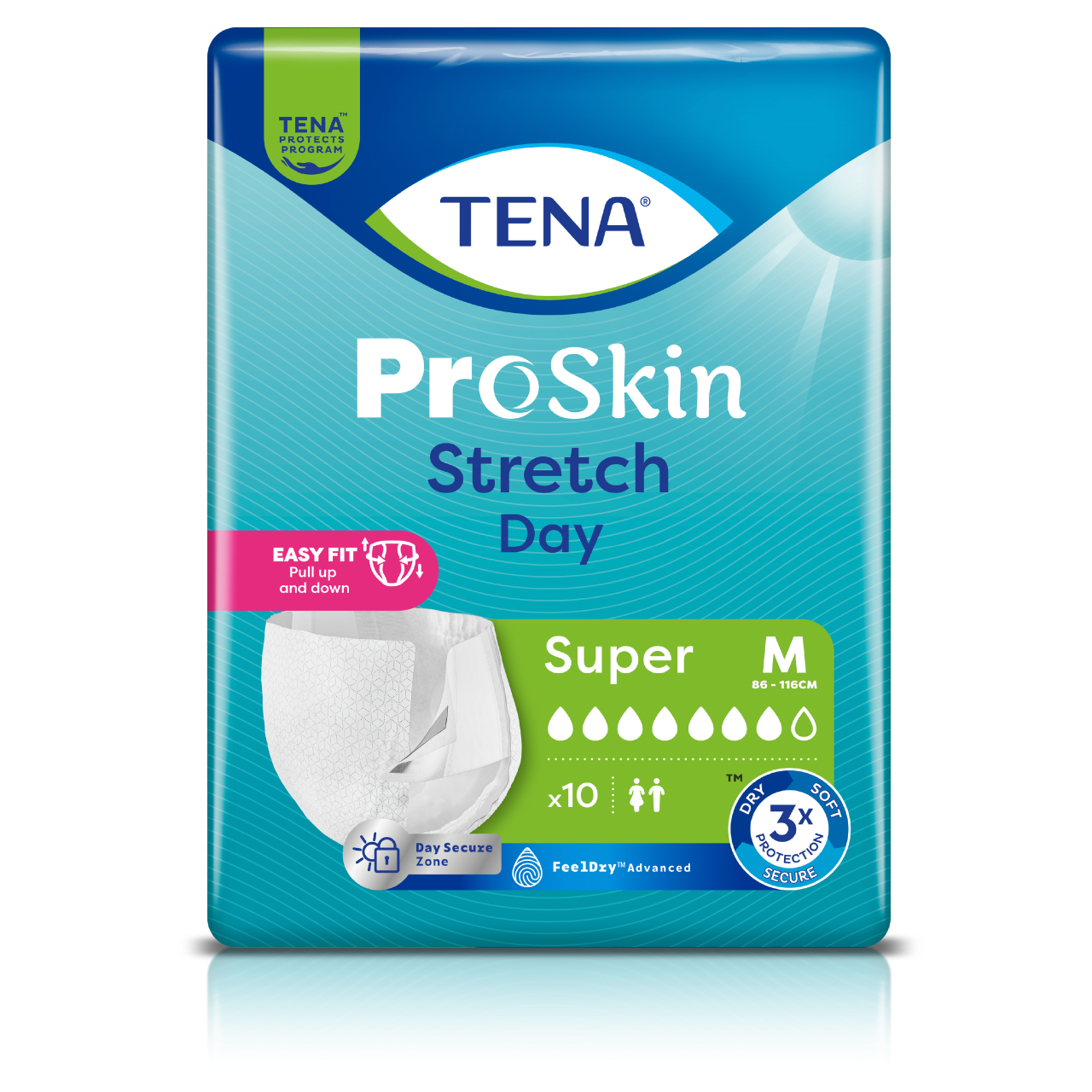 TENA Stretch ProSkin Super Day to doskonała alternatywa dla pieluchomajtek na rzepy. Można je założyć bez konieczności całkowitego rozbierania się i sięgania do ziemi (jak w przypadku zwykłej bielizny).
