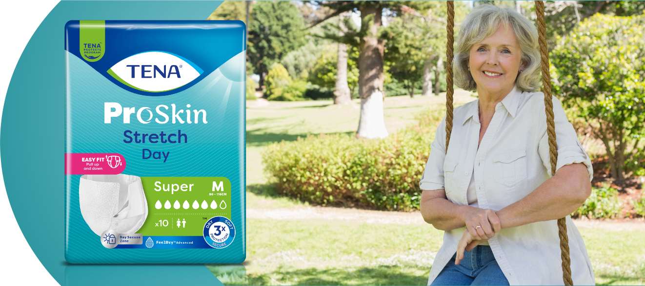 TENA Stretch ProSkin Super Day chronią przed przeciekami, nieprzyjemnym zapachem i wilgocią.
