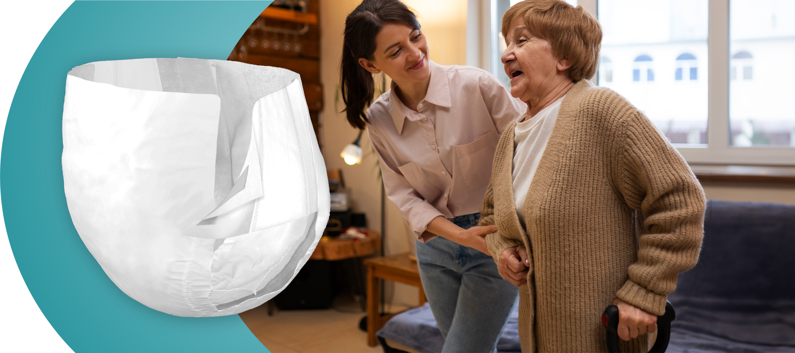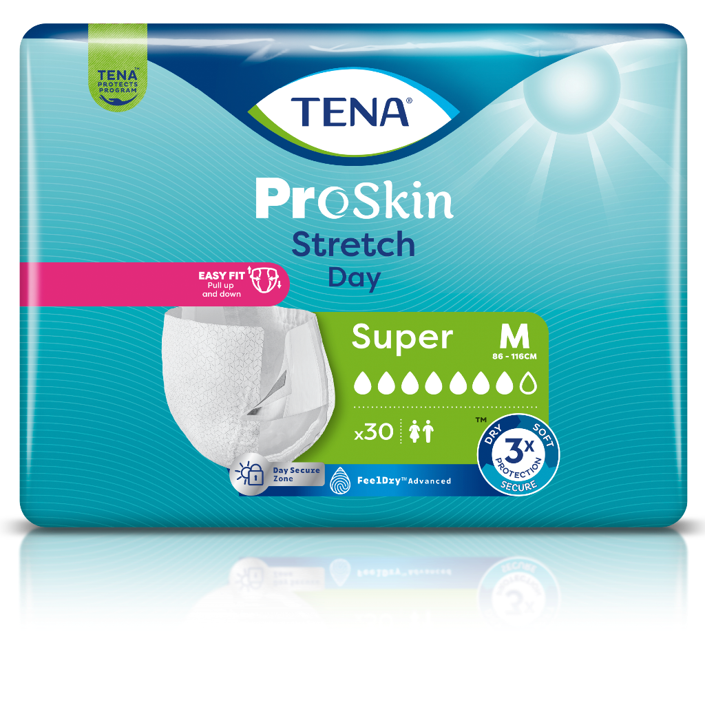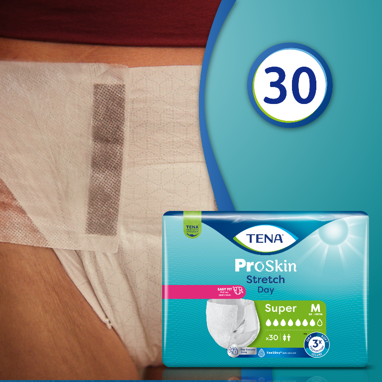 TENA Stretch ProSkin Super Day to doskonała alternatywa dla pieluchomajtek na rzepy. Można je założyć bez konieczności całkowitego rozbierania się i sięgania do ziemi (jak w przypadku zwykłej bielizny).